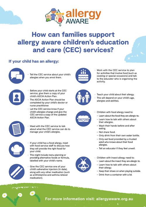 - How can families support allergy aware children’s education and care (CEC) services?