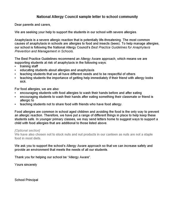 Sample letter about allergies and anaphylaxis for the primary school community