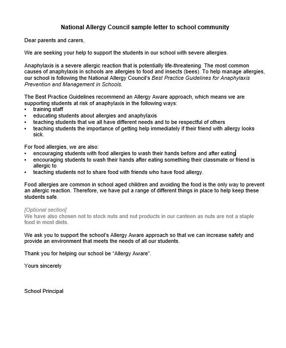 Sample letter about allergies and anaphylaxis for the secondary school community