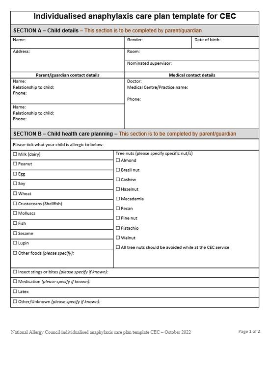 - Individualised anaphylaxis care plan template for CEC